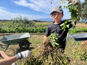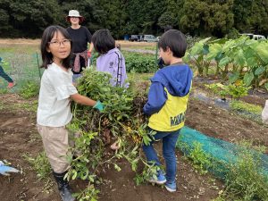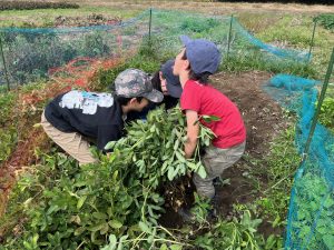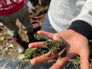 子どもたち、収穫の合間にはカエルや虫さんに夢中!畑ならではの体験ですね。